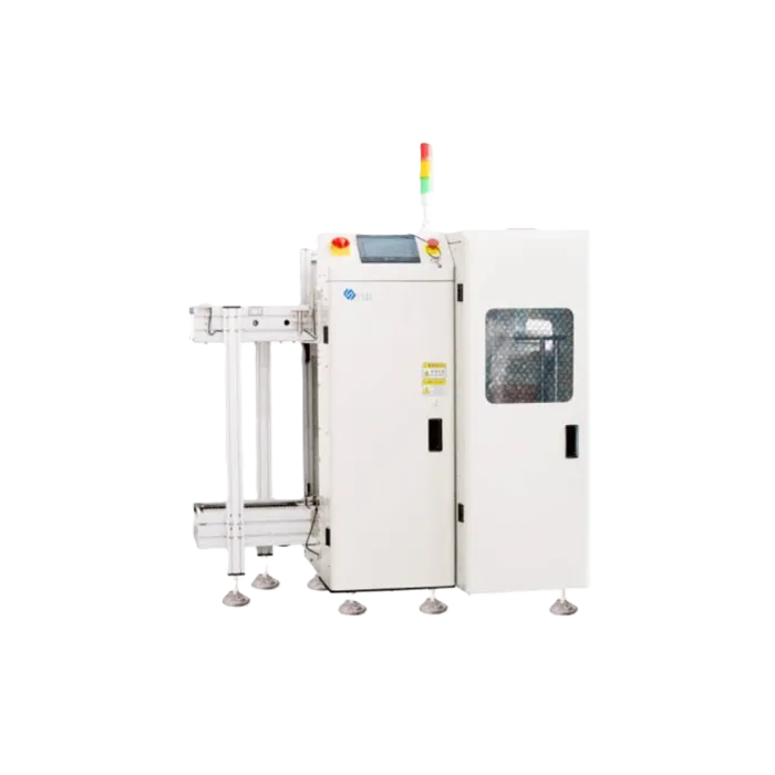 The machine is for automatic loading of bare PCB into production line by using vacuum suction cup to lift up the bare PCB and put onto conveyor and transfer to next machine.